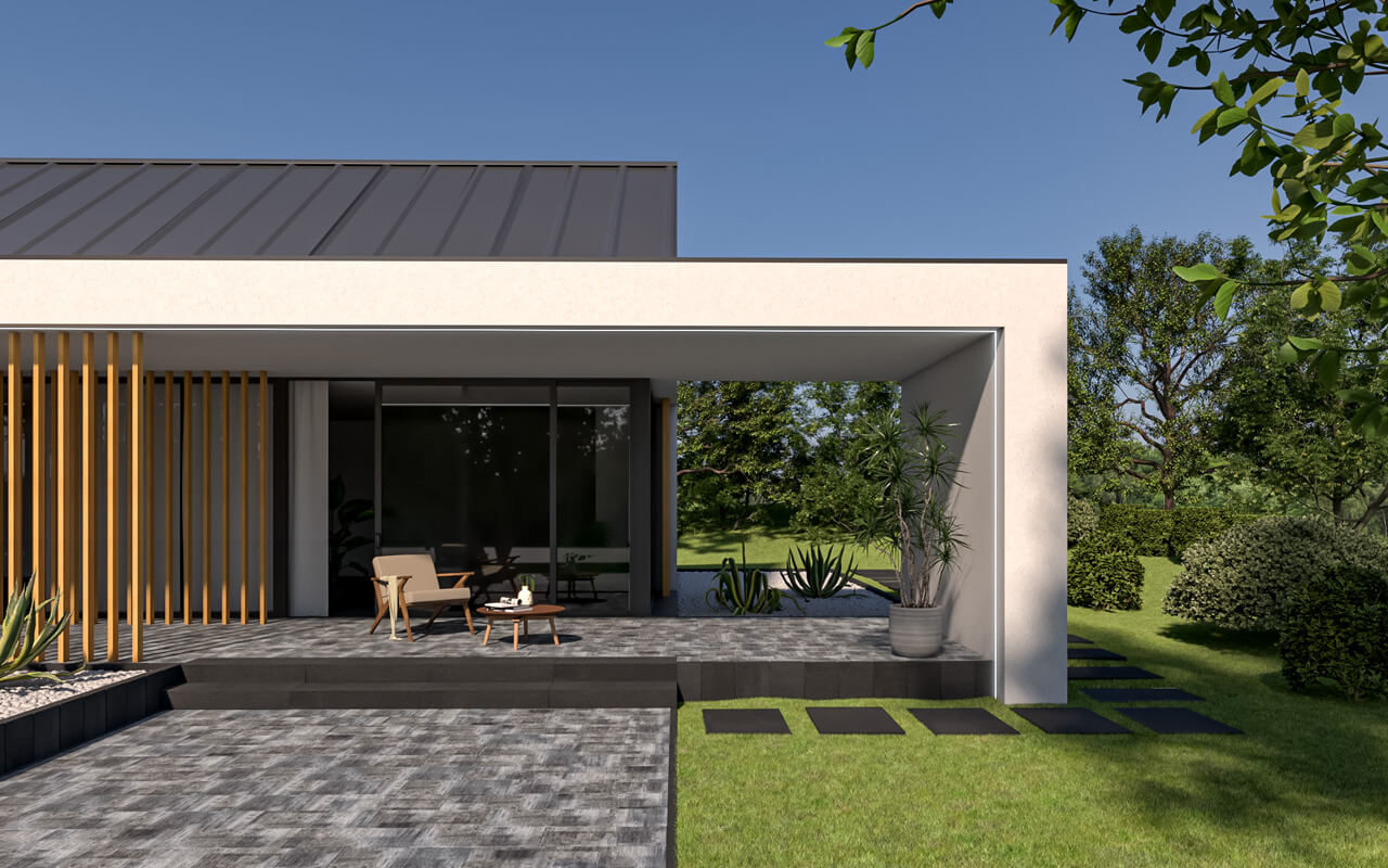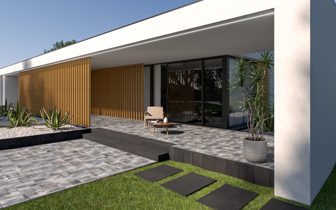 Duże płyty ENTRADA, dzięki swoim wymiarom nadają się idealnie na przydomowe podjazdy, altany i wiaty. Ich masywna konstrukcja oraz wykorzystanie nanofazy pozwalają na uzyskanie perfekcyjnie gładkiej nawierzchni, której zwieńczeniem mogą być równie eleganckie stopnie schodowe Ariba z najnowszej kolekcji BRUK Premium.